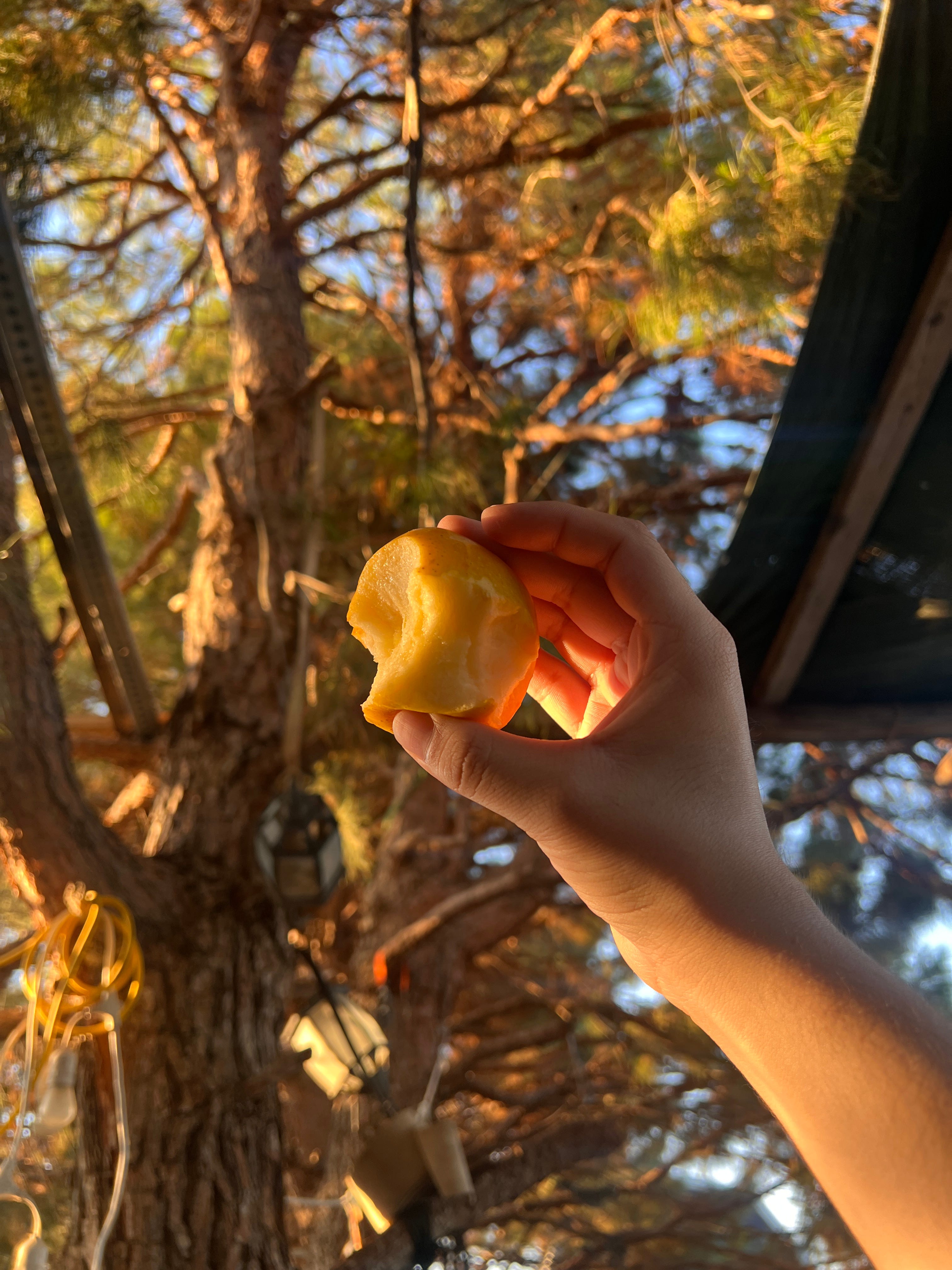Coming off of this failure, I kind of just got to exist as myself outside of being a student with my family. It felt refreshing, I felt a similar feeling to the amount of pressure lifted I felt in May. Not only did I get to exist with my family, but in nature as well. The night we got there, I got to sit in my grandpa’s hammock and eat a freshly-picked apple also from my grandpa. I took this gorgeous photo of it because of how beautiful the moment felt. I don’t even like apples!